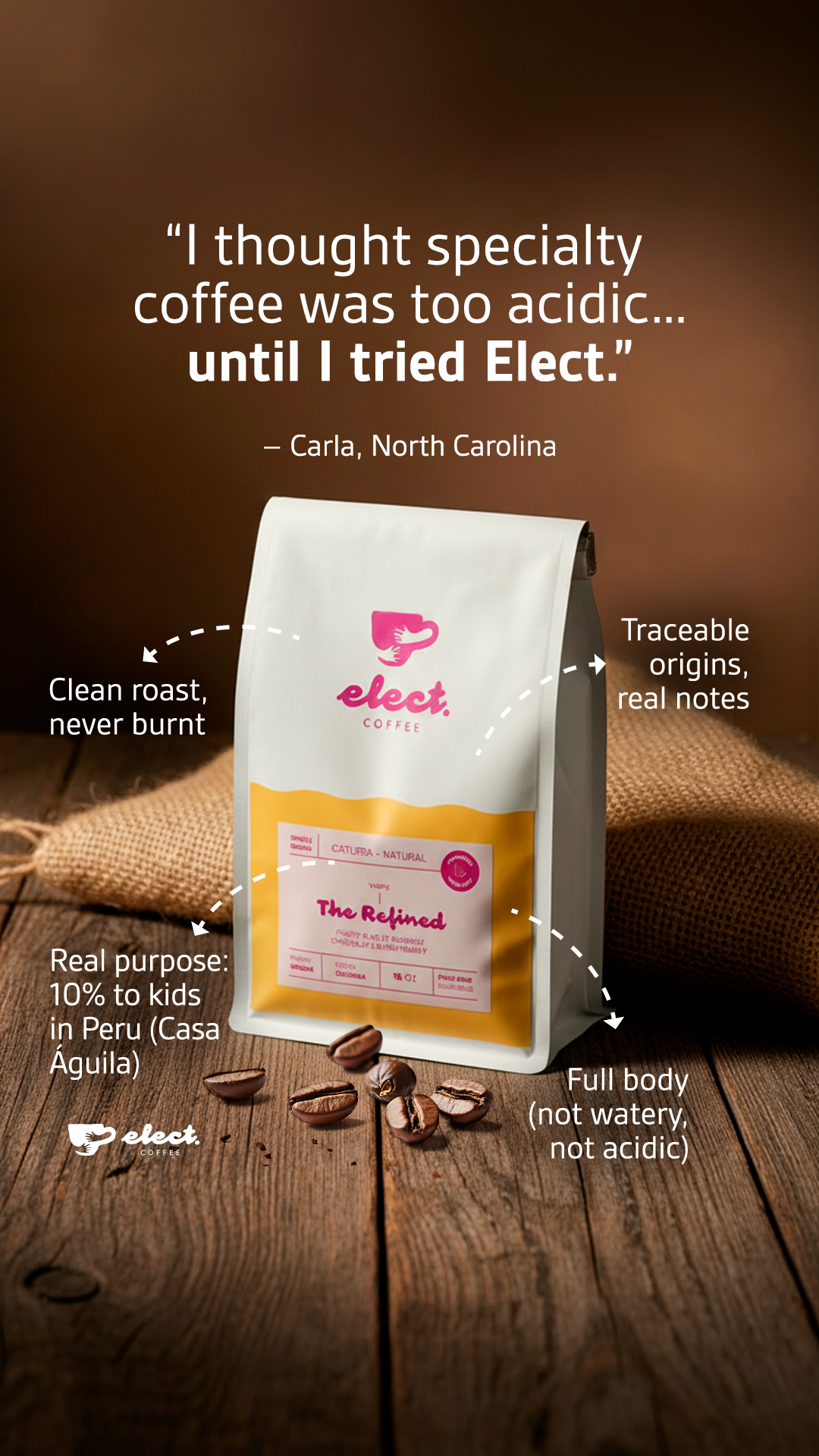Elect Coffee es una marca de café creada en Raleigh (North Carolina) con un propósito que va más allá de ofrecer un gran café de especialidad. Cada bolsa es una oportunidad para generar impacto positivo, conectando a una comunidad que cree en el consumo consciente y en apoyar causas que buscan un bien común. Su propuesta combina café de especialidad con una misión clara: usar la marca como un vehículo de cambio en la sociedad.